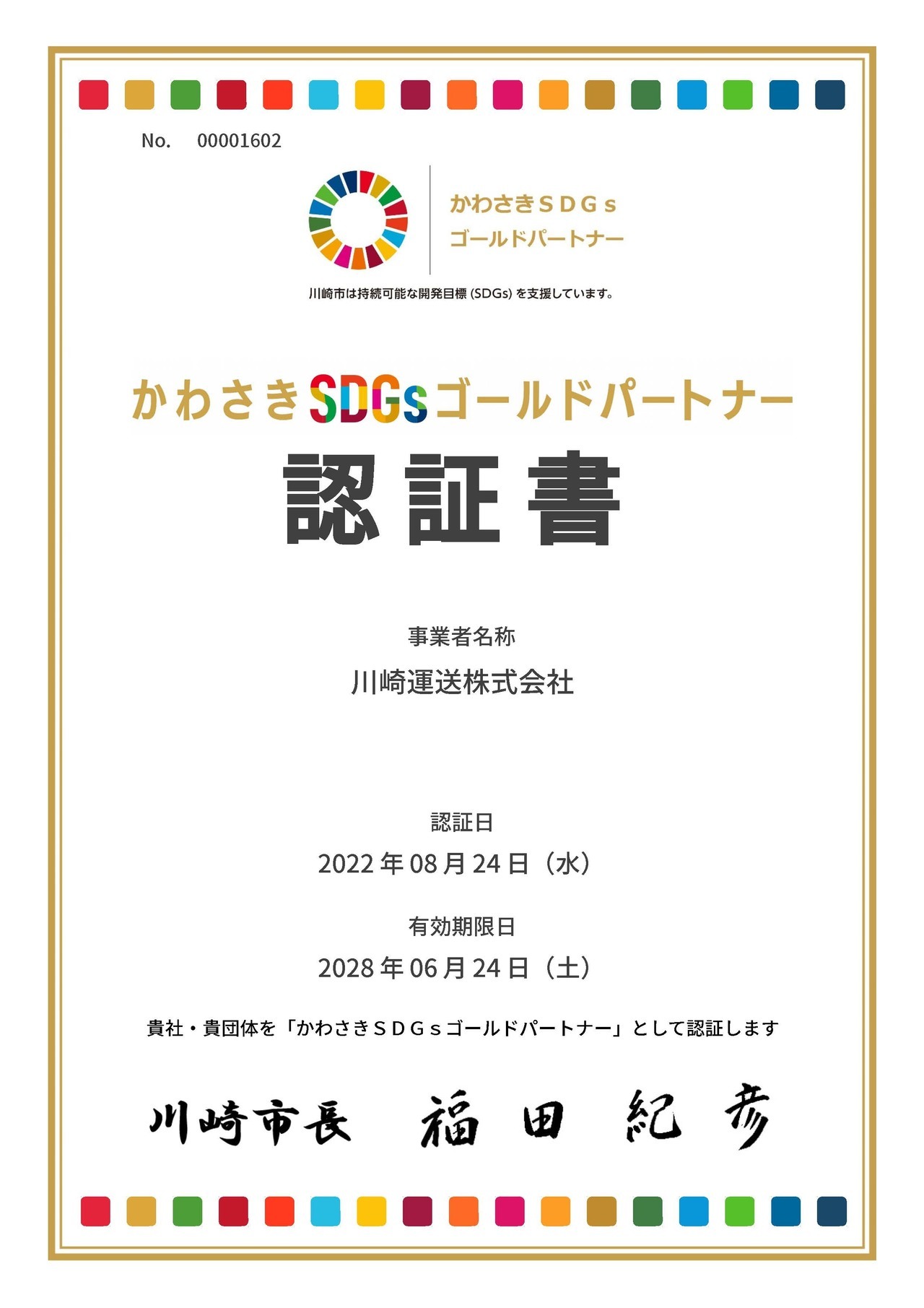 この度弊社は、2022年5月に申請しておりました「かわさきSDGsゴールドパートナー」の認証を受けました。