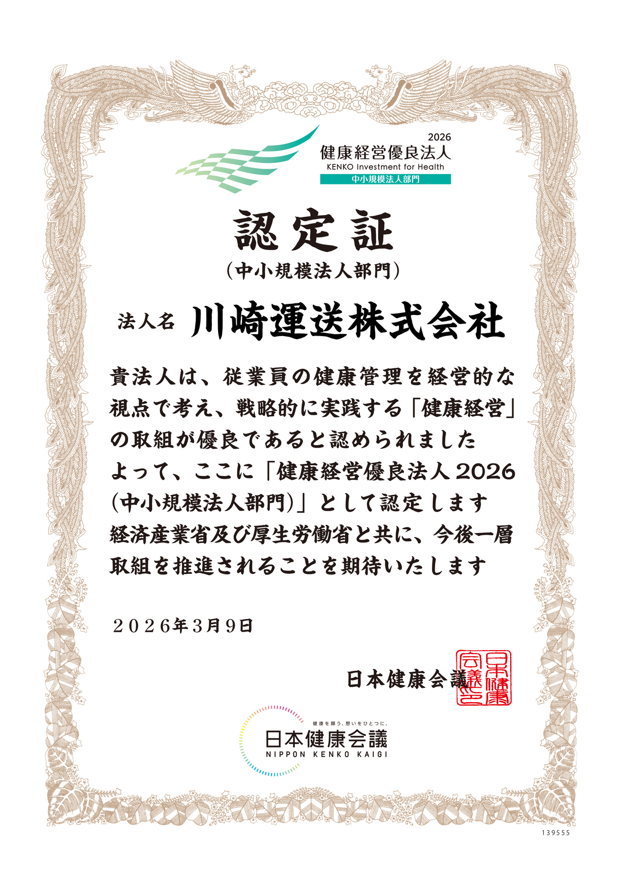 ・健康経営優良法人2026(中小規模法人部門)認定 (令和8年3月 経済産業省・日本健康会議より認定)